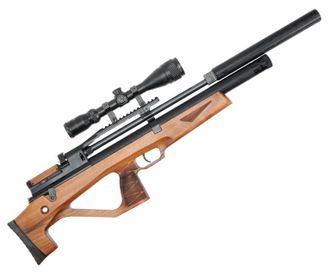 В комплекте с винтовкой: саундмодератор, магазин, лоток для однозарядной стрельбы, штуцер для заправки сжатым воздухом, ЗИП с резиновыми кольцами.